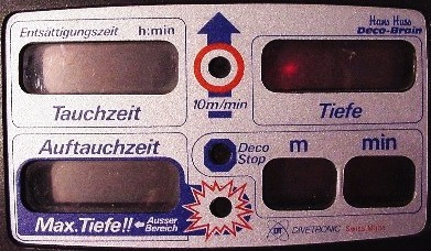 Verbreitung gefunden hat, der beliebte und verdammte, graue, hässliche, robuste ALADIN von der Schweizer Firma UWATEC. Sein Algorithmus läuft nach dem Bühlmann-Modell ZHL-12, mit sechs Geweben, mit Entsättigungszeiten zwischen 4 und 300 min und einer einheitlichen Aufstiegszeit von 10 m/min. Der erste der Familie merkt sich nur maximale Tiefe und Tauchbeginn von fünf Tauchgängen. Seine selbst wechselbare 3,6-V-Batterie hält etwa 800 Tauchgänge. Er lässt Tauchtiefen von 100 m zu. Spätere Modelle werden vor allem wegen der nur noch vom Hersteller zu wechselnden Batterie, der ungenauen Batterieanzeige und der festen Dekostufen kritisiert. Seine Verbreitung ist trotzdem eine ungeheure, und auch die Nachfolgemodelle finden ziemlichen Anklang. |