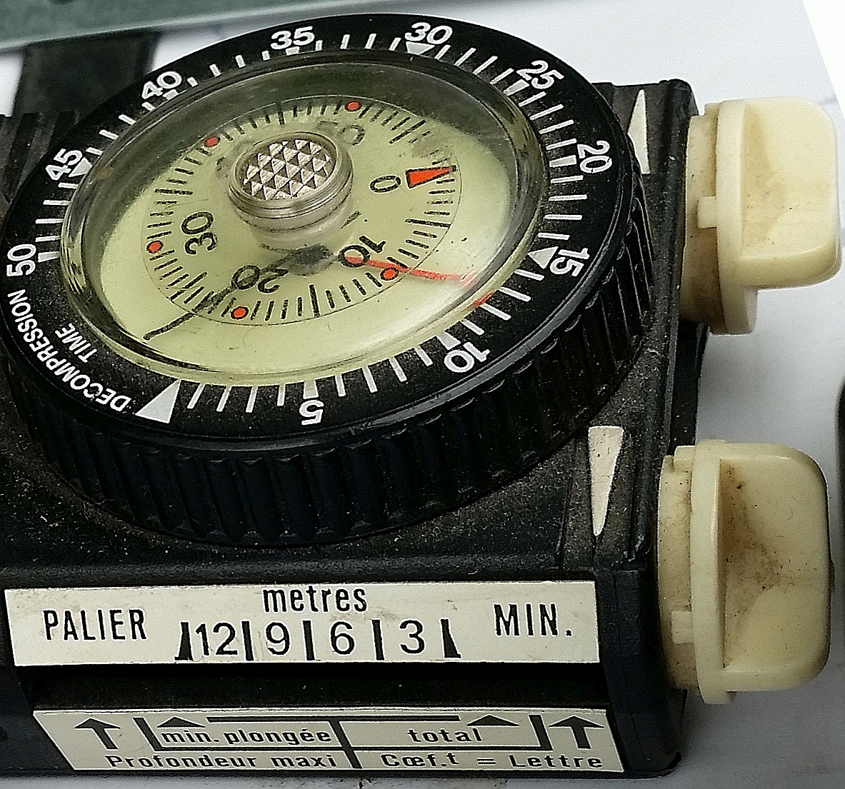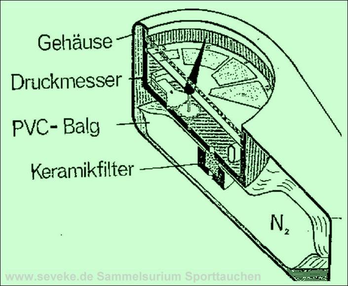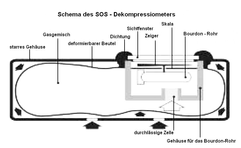 des späteren Dekometer vorweg und war mit zwei Geweben sogar besser. Dann kam 1958 das Dekometer von SOS, konstruiert von Carlo Alinari nach einer Idee des Unterwasser-Filmers Vittorio de Sanctis. Es arbeitete prinzipiell ähnlich wie der Mark I von Foxboro, aber in der Realisierung anders. Es verwendete nur ein Gewebe (Halbwertzeit 120min) und eine einzige Blase statt der 5 Faltenbälge des Foxboro. Es wurde wegen seiner Einfachheit und Zuverlässigkeit in verschiedenen Ausführungen die nächsten Jahre sehr verbreitet eingesetzt (Distribution über viele verschiedene Marken). Die Nutzbarkeit für tiefe und Wiederholungstauchgänge war aber wohl sehr umstritten, siehe 'DKM unter Druck' weiter unten. 1963 berichtete man auch in der DDR davon: |