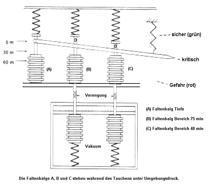 1975 die Leistungsfähigkeit des "single pneumatic resistor decompression computer" und kam zu dem Schluss: "Es wird nachgewiesen, daß sich die Zeitkonstante des Messers im umgekehrten Verhältnis zur Tauchtiefe ändert, so daß der Messer eine Mehrfachgewebe-Vorrichtung darstellt. Die Leistungsfähigkeit des Geräts wurde mit den ohne Dekompression Grenzen' der US-Marine verglichen. Der Gebrauch dieses Meßgerätes durch Freizeittaucher ist abzulehnen!" In die selbe Kategorie der pneumatischen Analogsysteme gehören noch die folgenden: |
