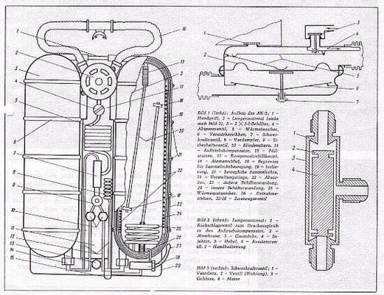 Allunionsausstellung erhielt es zwei Silber- und fünf Bronzemedaillen. Das Gerät ist bei den verschiedensten UW-Arbeiten bis in 45 m Tiefe einsetzbar, hat ein offenes Atemsystem und arbeitet mit flüssiger Luft oder flüssigen Luft-Sauerstoff-Gemischen. Der Vorrat befindet sich mit einer Temperatur von -190 °C in zwei Behältern. Die Einsatzdauer des AK-3 beträgt etwa das Vierfache der bisher gebräuchlichen DTG. Der einstufige Lungenautomat weist in 45 m Tiefe einen Atemwiderstand von etwa 500 Pa (50 mm WS) bei einem Luftverbrauch von 155 l/min auf. Die Verwendung von zwei Gaskomponenten ermöglicht bei vorgegebener Tiefe und Tauchzeit minimale DK-Zeiten durch entsprechende Gaszusammensetzung. |
