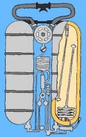Die Versuche zur Verwendung flüssiger Luft in Atemgeräten als Atemgasvorrat zeigen, daß sich die Masse und die Abmessungen der Apparatur vermindern und die Tauchzeiten verlängern lassen. Doch aufgrund dessen, daß das relative Gewicht des kompletten Gerätes im Wasser maximal ein Kilopond ohne Rücksicht auf das verwendete Material betragen soll und daß flüssige Luft 4,5mal dünner ist als Druckluft, sind die Vorteile der Anwendung eines offenen Gerätes mit flüssiger Luft nicht so offensichtlich. Berücksichtigt man noch die Verluste, die daraus entstehen, die Luft flüssig zu erhalten, so bleibt offensichtlich, daß der voluminöse Gewinn sich wahrscheinlich 1 zu 0,5 oder 3 zu 1 im Verhältnis zum normalen DTG verringert. Weiterhin muß man berücksichtigen, daß die aus dem Flüssigkeitsbehälter kommende Luft erwärmt werden muß. Zudem ergibt sich aus der Fraktionierung zwischen Sauerstoff und Stickstoff eine Gefahr: Im Laufe der Verdampfung kann es dazu kommen, daß zum Schluß im Behälter nur noch Sauerstoff verbleibt; unter bestimmten Bedingungen (Tiefe usw.) kann das zu einer ernsten Gefahr werden. |
