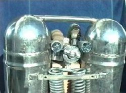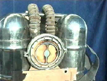 | Die Wärmedämmung wird durch Vakuum und Reflexion erreicht: Der Raum zwischen den inneren und äußeren Behältern ist mit Alu-beschichteten Folien ausgefüllt und dann bis zu einem Unterdruck von 0,133 Pa (0,001 mm Hg) evakuiert; weitere Druckreduzierung bewirken die Kälte und ein Absorber.Der Lungenautomat (Bild 2) weist keine prinzipiellen Besonderheiten auf, der geringe Atemwiderstand wird durch große Ventil- und Leitungsquerschnitte (über 38 mm²) erreicht. |