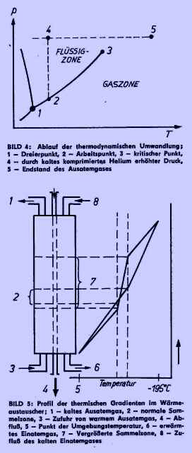 Sauerstoffs und somit pO2 steuern. Das System muß genügend gekühlt werden. Die einfachste Vorrichtung im offenen Zyklus besteht aus einem Druckbehälter, der mit Helium unter hohem Druck gefüllt und auf eine Temperatur von -195 °C gekühlt wird. Das Helium strömt dem Wärmeaustauscher zu und nimmt die Wärme des ausgeatmeten Gases auf. Das abgekühlte Ausatemgas wiederum kühlt den flüssigen Sauerstoff. Das Helium strömt aus dem Austauscher durch ein Regelventil ins Wasser. Dieses Ventil wird durch ein mit N2-Dampf gefülltes Druckthermometer gesteuert, das die Temperatur des flüssigen Sauerstoffs mißt. Steigt diese Temperatur über einen festen Punkt, dann öffnet durch den Druck das N2 das Regelventil, und das ausströmende Kühlelement bewirkt das Sinken der Temperatur. Eine andere Art, die ein der Volumen- und Gewichtseinheit angenähertes größeres Kühlpotential sichert, beruht auf der Wirkung flüssigen Stickstoffs als Kühlmittel. Seine Verwendung erfordert eine spezielle Ablaßtechnik für die Flüssigkeit: Für das Ausströmen der Flüssigkeit aus dem Behälter wurde ein Spezialsyphon (Bild 3) entwickelt, der aus einem Rohr mit porösen Wänden besteht. Das eine Ende ist dicht, das andere am Behälterausgang angeschlossen. Die poröse Masse, die das Rohr des Syphons umschließt, ist der Flüssigkeit entsprechend angepaßt. Durch eine entsprechende Krümmung des Rohres wird es immer von der Flüssigkeit umspült und in seiner gesamten Länge angefeuchtet; das Gas gelangt nicht ins Rohrinnere. Ist genug Flüssigkeit vorhanden, bleibt das Rohr naß. Man muß dabei beachten, daß der Druck des flüssigen Stickstoffdampfes bzw. des im Behälter eingeschlossenen Stickstoffs bei einer Temperatur von -195 °C ein atü oder weniger beträgt. Steigt der Druck im Behälter nicht, kann der Dampf nicht ausströmen und das flüssige Gas nicht herausgedrückt werden. Eine Temperaturerhöhung der Flüssigkeit aber würde das angestrebte Ziel durchkreuzen. Druckerhöhung im Behälter durch Einleiten von kaltem komprimiertem Helium führt nicht zum Temperatur-wechsel. Bild 4 zeigt den Ablauf der thermodynamischen Umwandlung: Wenn im Behälter nur eine Flüssigkeit und ihr Dampf sind, dann steht die gesamte Flüssigkeit im Punkt 1, auf der Übergangslinie zwischen Dampf und Flüssigkeit bei entsprechender Temperatur. In dem Moment, da das abgekühlte Helium in den Behälter gelangt, steigt der Druck ohne Temperaturänderung zum Punkt 4. Die Flüssigkeit bleibt unter Druck und ändert die Temperatur nicht. Wärme wird erst im Wärmeaustauscher zugeführt, und die Flüssigkeit verläßt den Behälter als Gas mit Umgebungstemperatur (Punkt 5). |