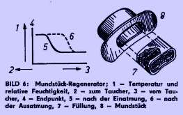 Trocknung des Atemgases dienende Silikongel eliminiert werden soll. So entsteht eine Situation, in der sich das durch den Regenerator fliehende Atemgas der Temperatur und Feuchtigkeit anpassen muß, wie sie im Generator festgelegt ist. Beim entsprechenden Entwurf kann man eine Leistungsfähigkeit von 90% erreichen. Bei einer Umgebungstemperatur von 10°C kann das Gas bis zu 32°C erwärmt werden und eine relative Feuchtigkeit von 90% enthalten. Der Durchflußwiderstand im Generator beträgt dabei etwa 25mm Wassersäule. Der Einsatz eines solchen Regenerators mäßigt wesentlich die Auswirkungen der Temperaturwechsel zwischen Ein- und Ausatmung, und die konstante Feuchtigkeit wirkt sich positiv auf das Wohlbefinden des Tauchers aus. In einem Gerät mit geschlossenem Kreislauf wird ein großer Teil der Feuchtigkeit absorbiert. Somit verringert sich die Belastung des Systems mit Wasser, was sich wieder positiv auf die nominale Arbeitszeit auswirkt. |