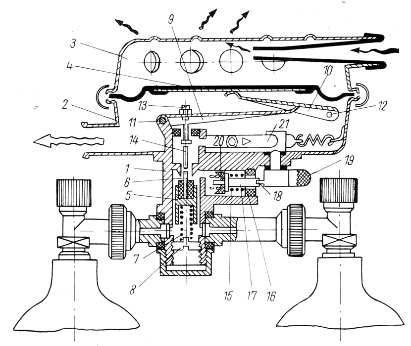 betrachtet werden soll. Auf der schematischen Schnittzeichnung des Lungenautomaten erkennt man, daß wie üblich die von der Membrane unter Einwirkung des Einatemunterdrucks in der Kammer 2 ausgeübte Kraft über die Hebel 10 und 9 auf das mit dem Druck dichtende Schließelement 5 des Ventils übertragen wird. Als Dichtungsmaterial findet Teflon Verwendung. Der Ventilhub kann durch die Regulierschraube 13 eingestellt werden. |