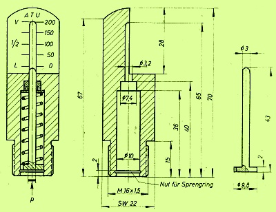 Hauptseite -> Altes --> Tauchen ohne Finimetre ---> Finimeter - einmal anders Hauptseite -> Basteln --> Präwendisches -------------^ P. Scharf, POSEIDON 1964 Zur Skizze: Am Hauptstück wird nach der Dreharbeit von oben her genau die Hälfte des Durchmessers 28mm lang abgefräst. Die am Kolben eingezeichnete Nut (eine Bohrung erfüllt den gleichen Zweck) dient dazu, daß im Interesse einer genauen Anzeige der Luftdruck bis zum Simmering gelangen kann. Auslenkende Kraft ist der Druck, der auf die Bodenfläche des 3-mm-starken Kolbens wirkt. Die Feder muß bei einem Viertel des Hubs einen Gegendruck von etwa 3,5 kp haben. Das entspricht dann dem Anzeigewert von 50 atü. Demnach bei halben Hub 7 kp (100 atü) und bei vollausgedrücktem Kolben (200 atü) etwa 14 kp. Kolben und Feder sind vor Inbetriebnahme mit Silikonfett einzuschmieren. Ein derartiges Finimeter ist unempfindlich gegen Stoß- und Schlageinwirkungen und jederzeit leicht abzulesen. Mmh, die Konstruktion stellt wohl an die Güte des