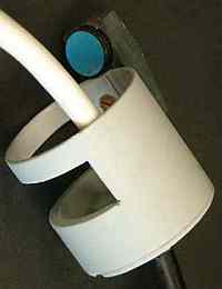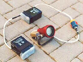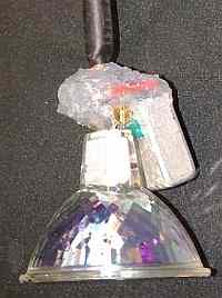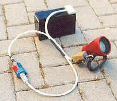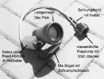oder spot (15°) bis 75W im Baumarkt oder bei CONRAD gibt. Gut bewährt hat sich ein Lampenkopf von DevPein aus eloxiertem Aluminium, der mit Glas, Strahler-Fassung und Kabeldurchführung geliefert wird (etwa 140DM). Da schraube ich einen Ms-Bügel (Baumarkt) als Goodman Handle und einen Schalter dran, der aus einem REED-Kontakt und einem gekapselten 12-V-Relais besteht, die in Heißkleber vergossen sind. ![]() |