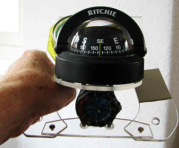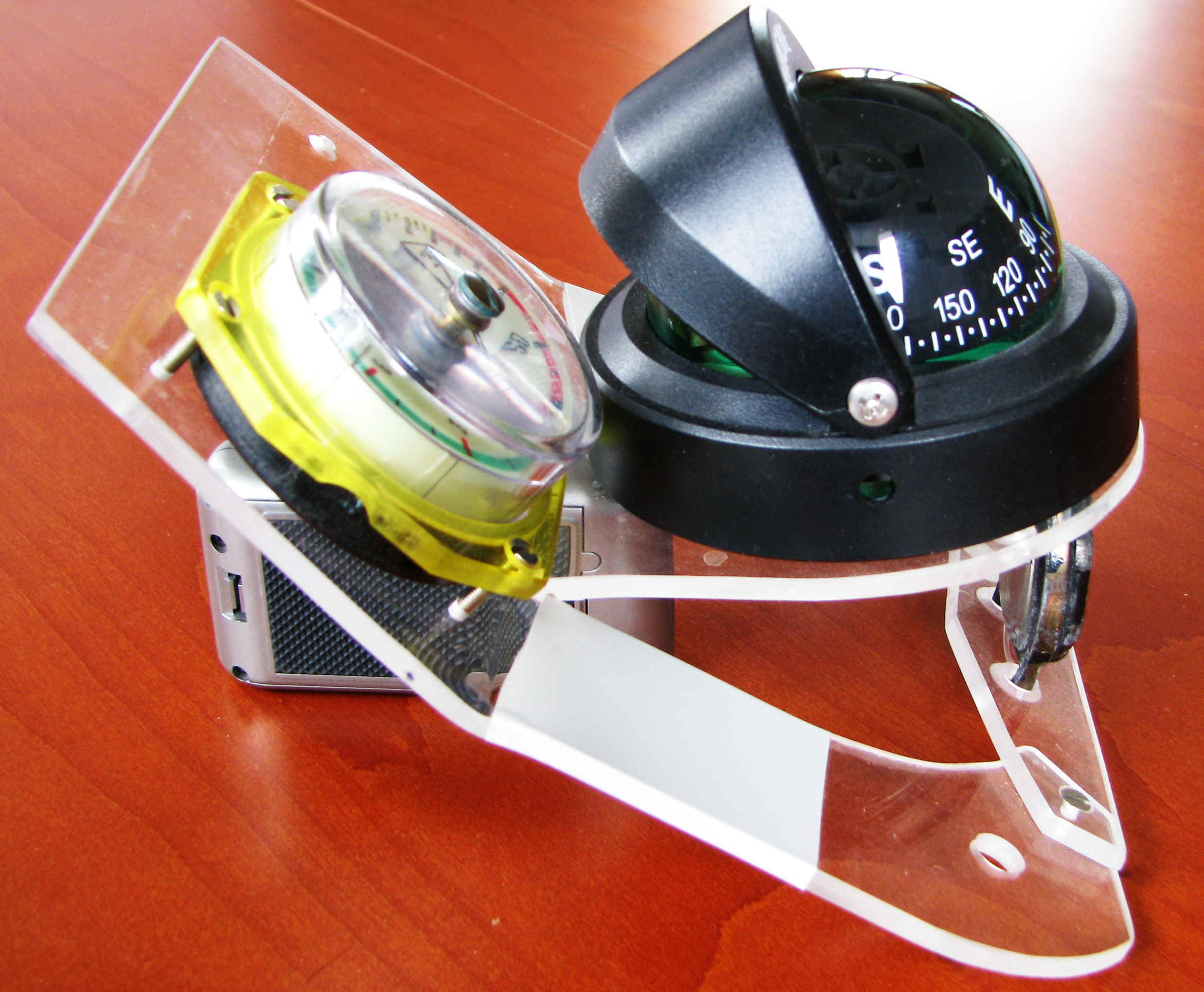 Computer gut ablesen. Um die beiden Handgriffe ist weiße Klebefolie gewickelt, auf der man ev. Kursdaten mit einem Faserstift notieren kann. Der Kompass ist sehr gut ablesbar, er könnte für die Nacht sogar beleuchtet werden. Am hinteren Ende der Handgriffe sind Löcher für eine Schnur, an der man sich das Brett um den Hals hängen kann. Wenn man die Schnur länger macht und an einer Seite mit einer Stopperklemme versieht, kann man das Brett im unbenutzen Zustand vor der Brust hängen lassen und bei Gebrauch nach vorne ziehen, ohne die Schnur vom Hals nehmen zu müssen. |