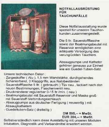 Notfallausrüstung(Sauerstoff) aus und kann mir Tips geben, Erst mal ein ganz wichtiger TIP: Mach' einen DAN-O2-Provider-Kurs, damit Du schonmal die Grundlagen hast. Zu den Systemen: Es gibt vom Prinzip her mehrere unterschiedliche O2-Systeme: 1. Systeme mit bedarfsabhaengiger SteuerungDa ist quasi 'ne Art O2-Lungenautomat dran (z.B. DAN System). Das ist im Prinzip das beste System, da wirklich nahezu 100% reiner Sauerstoff verabreicht werden kann. Zudem ist es sparsamer als Systeme mit Konstantfluss (2.). Leider nicht ganz billig. Eine kommerzielle Lösung für den Taucher-Notfallkoffer sieht so aus (Lieferant auf Anfrage). Claudia B. Das Thema Notfallkoffer hat mich auch schon mal eingehendst beschäftigt. Am besten ist, man hat einen DAN-Kurs besucht, dann weiß man, wonach man grob suchen sollte. (Flasche mit Druckminderer + 1 großer Maske + 1 kl. Maske + (wenn das Geld stimmt) Atemregler, Beatmungsmaske (oder eine Kombination) Die Koffer extra für Taucher (DAN etc.) sind m.E. vollkommen überteuert. Am besten man geht in ein hiesiges Sanitätshaus (die auch Prothesen und so Zeugs verkaufen). Entweder die haben was im Angebot oder aber können dir jemanden nennen. Oder man kennt jemanden, der Rettungssani-Täter ist ;-)) Die Händler, welche medizinische Einrichtungen beliefern, sind recht günstig. Hier in Dresden gibt es z.B. einen Vertreter von A.R.U. Medizintechnik Arnold OHG, Klaus Starke Tel.: 0351 / 25958-0, der hat alles im Angebot. Vielleicht kann der Dir einen Katalog senden oder einen "Kollegen" in Deiner Nähe sagen. Wenn man damit umgehen kann, kann man sich ja dann im Sanitätshaus noch div. anderen Kram dazukaufen (so'n Herz-Druckding für HLW, Spatel fürn Rachen, Rettungsdecke, Aspirin ;-)) etc.. und noch ein Operationsbesteck für 'ne komplette Organverpflanzung.... Den Preis für so ein ganzes Gelump kann man sich ja evtl teilen mit anderen Leuten, mit denen man immer tauchen geht. Es muß dann bloß jeder damit umgehen können und auch wissen, in welchem Auto es sich befindet bzw. auch Zugang haben.