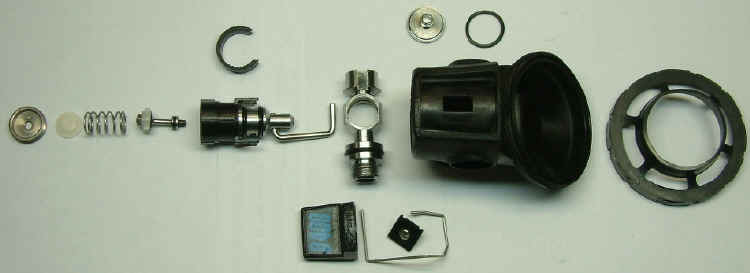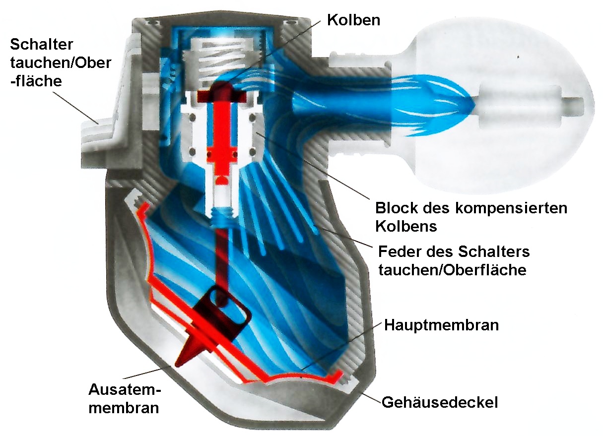 Scubapro noch gepflegt), habe ich einen bei e...y erworben. Durch den etwas klobigen Soft-Cover wirkt der D400 wie von Christo verpackt. Darunter zeigt sich aber das gleiche filigrane Ventilsteuerwerk wie beim Air I. Die Ventilierung beim Ausatmen erfolgt aber nicht durch das Abheben der Hauptmembran sondern durch ein separates Flatterventil im Zentrum der Hauptmembran, was den Mechanismus schon mal vereinfacht. Das Kolbensystem ist aber im Wesentlichen gleich geblieben. ![]() In den Reglern Pilot bis D400 ist ein sog. Spulenventil eingesetzt. Das Prinzip dieses Ventils ist etas kompliziert zu verstehen, wird aber von Pete Wolfinger im SCUBAPRO Service Manual sehr gut erläutert. |