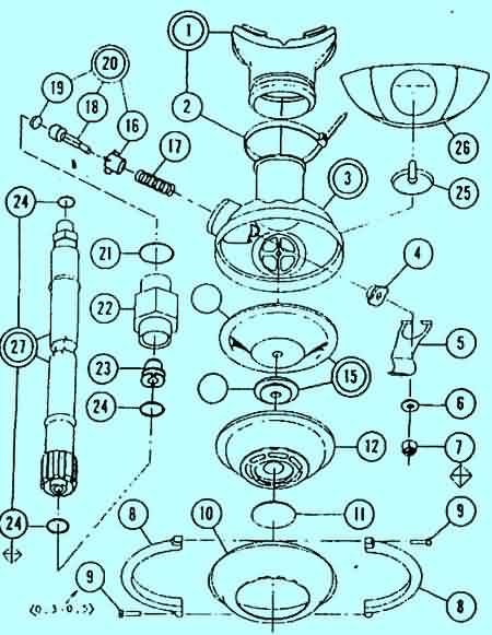 zweiten Stufen mit einem Upstream-Kippventil ausgestattet waren. Das hatte zwei Vorteile: - Der Atemwiderstand ist etwas kleiner. - Bei einer Störung in der ersten Stufe kann die zweite Stufe einfach abblasen, ein Überdruckventil ist nicht nötig. Das gibt's heute noch bei einfachen zweiten Stufen wie R295 oder R395. 1981 wurde der 108 überarbeitet und danach H.P. (High Performance) genannt. Diese Stufe wurde bis 1988 gebaut. Nachfolger war dann der bekannte R190, der in Riesenstückzahlen verkauft wurde. |
