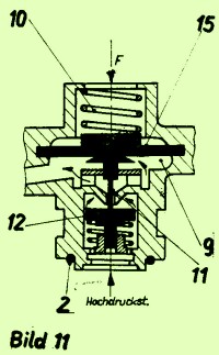 aufgebaut und eingestellt, daß die Kraft F an der Hochdruckfeder (Teil 10), die über