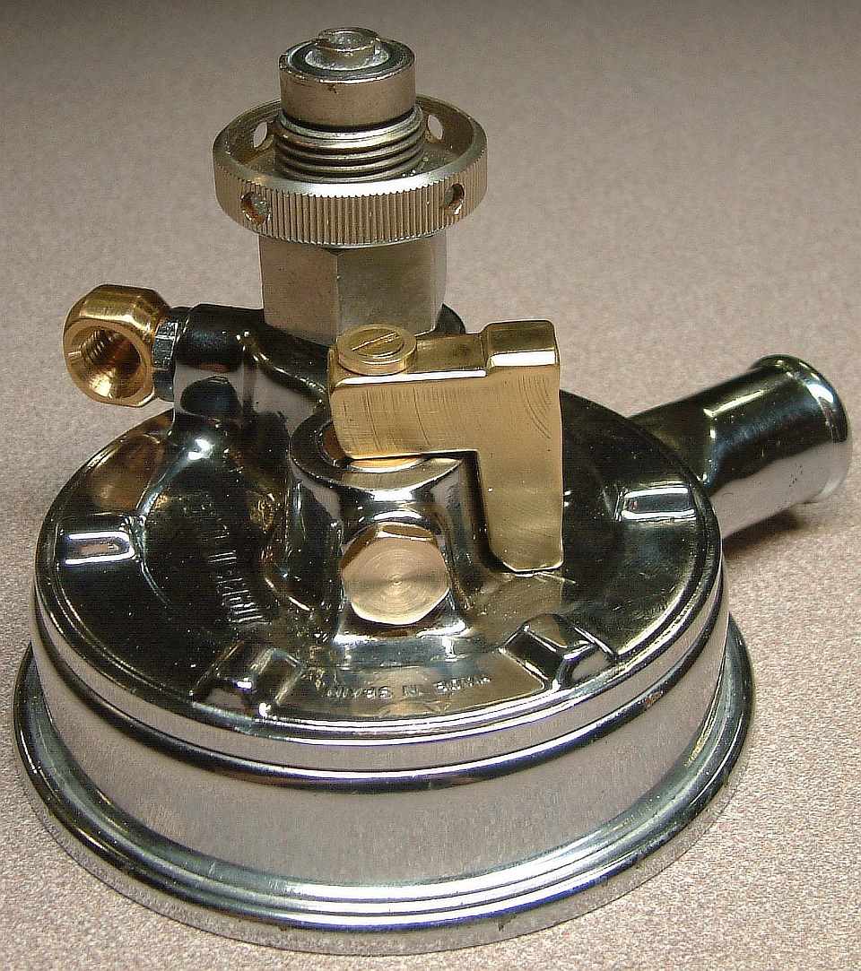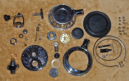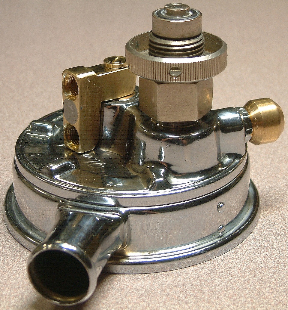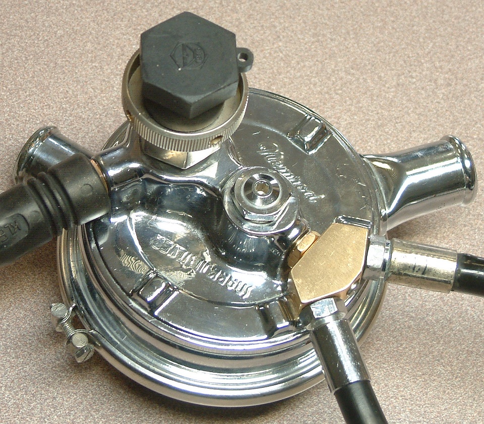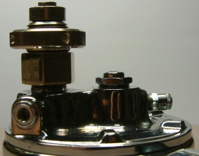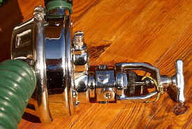 Wenn man das nicht will, kann man die Unterschale auf der Grundplatte verdrehen. Damit lässt man den Regler möglichst weit nach unten ragen, wie es für die Atemarbeit günstiger ist. Damit dreht sich aber auch das Scharnier des Membranhebels mit, sodass die beiden Hebel nicht mehr zusammenpassen. Wenn man ein neues Scharnier für den Hebel anfertigt, das man mit den Schrauben befestigt, die den Ring auf der Grundplatte halten, kann man den Regler in 60°-Schritten so verdrehen, wie es von der Lage der Anschlüsse her am besten ist. |