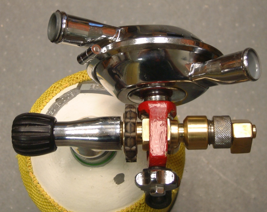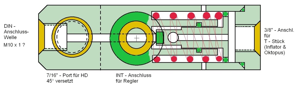 abschrauben, damit der INT-Bügel drüber passt. Dem Flaschenanschluss gegenüber kann ein Miniregler eingeschraubt werden, der MD liefert. Vom Miniregler gegen zwei MD-POrts abwärts. |