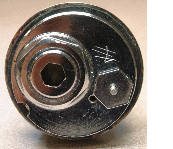 abgesägt und der Boden des Gehäuseblockes plangedreht. Dann bohrt man Schraubenlöcher in den Reglerblock, dorthin, wo keine inneren Bohrungen liegen. Das geht leider nicht ganz symmetrisch, aber doch ausreichend in Kreuzform. |